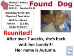 Everyone can appreciate a happy ending like this one! Not everyone can appreciate the thanks that Randi deserves for caring for Autumn, aka Dora, for seven weeks, though. Randi loved the Dachshund she took in enough to get her current on her shots and offer her a permanent home … and, above all, Randi loved the dog enough to return her to her rightful owners. Thank you, Randi!