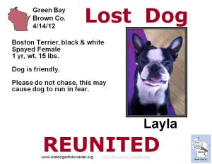 Layla is now home with her rightful owners because they distributed flyers. They not only retained hope that they would be reunited with their dog while she was missing, they greatly increased the odds that Layla would be returned to them by taking action…by handing out and posting flyers. Without their efforts, the couple who originally found Layla would never have known that the dog didn’t make it to the Humane Society…and Layla would still be missing.