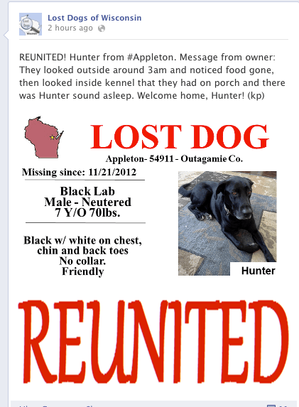 Worried about the lab he regards more as “a son” than “a dog,” Hunter’s owner took immediate action. He reached out to Lost Dogs of Wisconsin for tips and suggestions on how to bring Hunter home safely. Upon suggestion, Hunter’s owner placed one of his shirts, a dish of food, and Hunter’s kennel outside in case Hunter returned home. Rather than sending Hunter’s owner on a fruitless search around the neighborhood, Lost Dogs encouraged Hunter’s owner to have as many people as he could spread the word on Facebook, which he did immediately. Lost Dogs was also able to provide Hunter’s owner with flyers to hand out and posters to hang with the hope of generating sightings that would lead Hunter’s owner to his recovery.