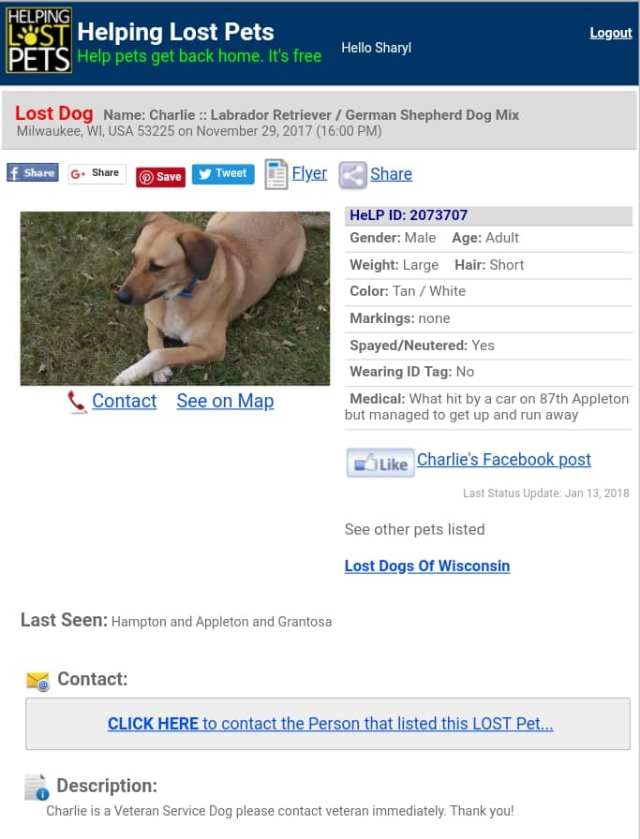 Charlie, a Veteran’s service dog went missing since November 29, 2017 from his home in Milwaukee. There were some reports from eyewitnesses who had seen him get hit by a car and then run off.