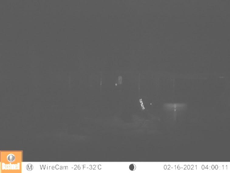 That weekend the family had to leave for a couple of days because their daughter and friends were planning to stay at the cabin for their 12th annual ‘girls’ weekend’. Our volunteer and their daughter assured them to not worry as we’d all continue with the process. The next evening our volunteer arrived at the site to refresh the food (grilling) and to check the cams around the lake. The temps were -26 and we knew it was not likely a lost dog would venture out but we wanted to do all we could to continue to lure him to the trap. After she checked grilled and checked cams (no sightings) her brand new car refused to start! Roadside service was called but they couldn’t get to her until the next morning. She was stranded an hour away from home in subzero temperatures. She knocked on the cabin door and explained her situation to the ladies staying for the weekend and they warmly welcomed her with food, a bed and a brand-new toothbrush. Roadside arrived bright and early the next morning to get her back home. Tip: Leave car running if possible when checking trail cams in subzero temperatures! Dexter had now been out five nights out in subzero temperatures.