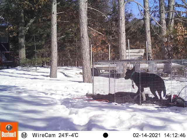 Our volunteer immediately drove to the site to help with the trapping process but on the way there suggested the owners set the trap on their own so we did not miss an opportunity. They all sat inside the lake home watching through the massive windows waiting and waiting. No Dexter. They waited until nearly 10 pm but unfortunately had to bungee the door open and Dexter needed to spend yet another (seventh) night out in the subzero cold.