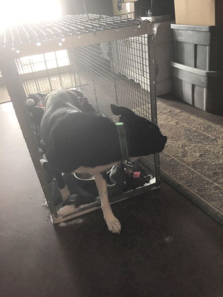 Now that sightings had resumed and we could confirm he went into trap we could begin the trapping process. The trap door had been bungeed open and the back had been taken off creating a ‘tunnel’. This allowed him to enter through both sides of the trap. It’s a technique used to help get a dog comfortable going all the way in (and through). We still needed to make sure he would still go inside the trap with the back door replaced. We replaced the door and the food replenished and waited. No Dexter. That night temperatures dipped to -33 below. Our volunteer kept vigil on her trail cam during overnight hoping to see Dexter, no luck. Then finally at 8:30AM he arrived! He looked great and we were ecstatic that he survived the coldest night of the week and was still coming around for food. We had one more step and that was to try to confirm that he didn’t bump his head on the trap door while entering (it was being held up with a bungee cord so if he bumped it, it would not come down). If he bumped his head on the door there was a risk of it coming down on him allowing him to back out. Being a shy and timid dog if this occurred it would more than likely prevent him from entering the trap again setting us back days, weeks or even months. So while it was extremely cold, it was more important to be patient and get it right the first time. Dexter would need to spend a sixth cold night on his own before we could visually confirm he ‘ducked’ his way into the trap. The next day the owners arrived, refreshed the food and waited. Early afternoon they visually watched him enter the trap with no head bump, we were ready to set the trap!